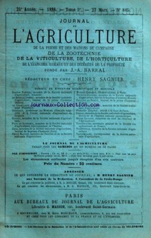 SOMMAIRE DES ARTICLES - CHRONIQUE AGRICOLE PAR HENRY SAGNIER - NOUVELLES DES CULTURES ET DES TRAVAUX AGRICOLES PAR PAGNOUL NANTIER BRONSVICK DE LENTILHAC - PHYSIOLOGIE ET CULTURE DU BLE PAR M RISLER PAR PAUL DE GASPARIN - PARTIE OFFICIELLE - INSTRUCTIONS AUX PROFESSEURS DEPARTEMENTAUX DÔÇÖAGRICULTURE SUR LE TRAITEMENT DES VIGNES CONTRE LE MILDEW - EMPLOI DU SORGHO COMME FOURRAGE PAR P P D - EXPERIENCES A LA FERME DE BELLEVUE EN 1885 PAR PAUL GENAY - BIBLIOGRAPHIE AGRICOLE PAR HENRY SAGNIER - SUR LÔÇÖORGANISATION DES CONCOURS AGRICOLES - LÔÇÖAGRICULTURE ET LES EXPOSITIONS FRANCAISES PAR MERCIER - LES MACHINES AU CONCOURS DE PARIS - II - REPRESENTATION OFFICIELLE DE LÔÇÖAGRICULTURE PAR DE LA MORVONNAIS - CULTURE DU LIN EN SOLOGNE PAR GAUGIRAN - SOCIETE NATIONALE DÔÇÖAGRICULTURE - SEANCE DU 24 MARS - REVUE COMMERCIALE ET PRIX COURANT DES DENREES AGRICOLES PAR REMY - MARCHES AUX BESTIAUX DE LA VILLETTE DU 25 MARS - BOITE AUX LETTRES - GRAVURES NOIRES - VUE DES JARDINS DU CHATEAU DE NOIZI - VUE A VOL DÔÇÖOISEAU DU BOIS DE VINCENNES - PARC EXECUTE EN BRETAGNE PAR LE COMTE DE CHOULOT