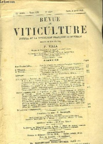 RO30075612. REVUE DE VITICULTURE - JOURNAL DE LA VITICULTURE FRANCAIS ET MONDIALE - 29° ANNEE - TOME 56 - N°1449. 06-04-1922. In-8. Broché. Bon état, Couv. convenable, Dos satisfaisant, Intérieur frais. Paginé de 262 à 280. Nombreuses illustrations en noir et blanc dans le texte. Une planche illustrée en couleurs.. . . . Classification Dewey : 634.8-Viticulture, vin